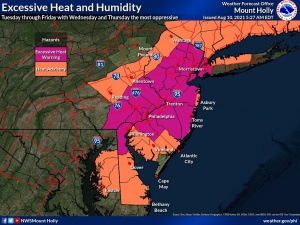 New Jersey’s first heat wave of August is expected to arrive on Tuesday and could last through Friday as a tropical air mass settles over our region and pumps in hot, humid air. Heat and humidity will become increasingly more oppressive as the week progresses. An Excessive Heat Warning and Heat Advisories are now in effect for Wednesday and Thursday, when dangerously high Heat Index values of 100-105° or greater are expected. If you must be outdoors during the afternoon or early evening hours, wear light clothing, take frequent breaks, and drink plenty of water. Check on your friends, family, and neighbors who may be susceptible to heat illnesses, especially if they do not have air conditioning. National Weather Forecast.
