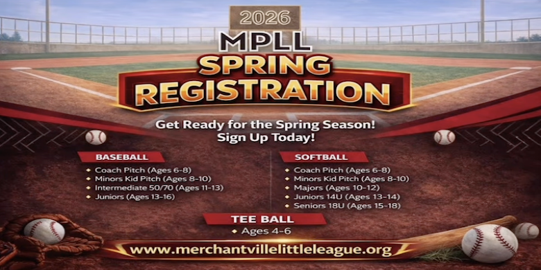 MPLL Spring 2026 Registration is OPEN! Spring baseball and softball are right around the corner, and we’re ready to get the kids back on the field! Get ready to register your kids now at www.merchantvillelittleleague.org and let the baseball fun begin. Save the date - Saturday, February 7th from 10:00 a.m. to 12:00 p.m. for in-person sign-ups at Bloomfield Fire House. Baseball & Softball programs available. All age groups - from Tee Ball to Seniors.